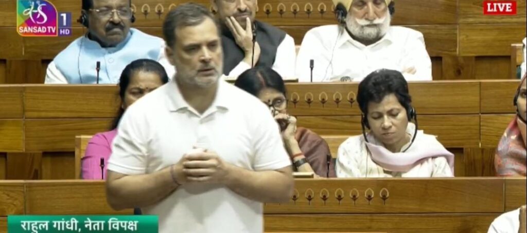 राहुल गांधी ने अपने संबोधन में कहा कि सरकार यह सुनिश्चित करने की कोशिश कर रही है कि अगले 15 वर्षों तक जाति जनगणना का प्रतिनिधित्व से कोई संबंध न रहे। विपक्ष के नेता ने आगे कहा कि भाजपा को अपनी शक्ति में गिरावट का डर सता रहा है, सरकार भारतीय राजनीतिक मानचित्र को बदलने की कोशिश कर रही है।लोकसभा में विपक्ष के नेता राहुल गांधी ने कहा, ‘कल मैं अपनी बहन को कुछ ऐसा करते हुए देख रहा था जो उसने पांच मिनट में हासिल कर लिया, जो मैं शायद अपने 20 साल के राजनीतिक करियर में नहीं कर पाया – अमित शाह को मुस्कुराने पर मजबूर करना।’राहुल गांधी ने इस दौरान कहा कि दक्षिण के राज्यों को घबराने की जरूरत नहीं है, हम दक्षिण का प्रतिनिधित्व कम नहीं होने देंगे। राहुल गांधी ने कहा- मैं दक्षिणी, पूर्वोत्तर और छोटे राज्यों को आश्वस्त करना चाहता हूं कि हम सरकार को भारत संघ में आपके प्रतिनिधित्व को छूने नहीं देंगे। राहुल गांधी ने लोकसभा में कहा कि सरकार जो कर रही है वह राष्ट्रविरोधी कृत्य से कम नहीं है; हम आपको ऐसा नहीं करने देंगे, पूरा विपक्ष इसे हराएगा।