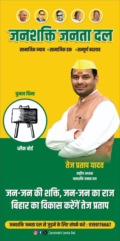 राष्ट्रीय जनता दल के पूर्व नेता और लालू प्रसाद यादव के बड़े बेटे तेज प्रताप यादव अपनी नई पार्टी बनाकर बिहार विधानसभा चुनाव के मैदान कूद चुके हैं। तेज प्रताप यादव की नई पार्टी का नाम ‘जनशक्ति जनता दल’ है और इसका चुनाव चिह्न ‘ब्लैक बोर्ड’ है। तेज प्रताप यादव ने अपने आधिकारिक X हैंडल से पार्टी के पोस्टर को भी शेयर किया है।पार्टी का पोस्टर शेयर करते हुए तेज प्रताप यादव ने अपने आधिकारिक X हैंडल पर लिखा- “हमलोग बिहार के संपूर्ण विकास के लिए पूर्ण रूप से समर्पित और तत्पर हैं। हमारा मकसद बिहार में संपूर्ण बदलाव कर एक नई व्यवस्था का नव निर्माण करना है। हमलोग बिहार के संपूर्ण विकास के लिए लंबी लड़ाई लड़ने को तैयार हैं।तेज प्रताप यादव ने पार्टी का जो पोस्टर लॉन्च किया है उसमें उन्होंने 5 महापुरुषों और नेताओं को भी शामिल किया है।